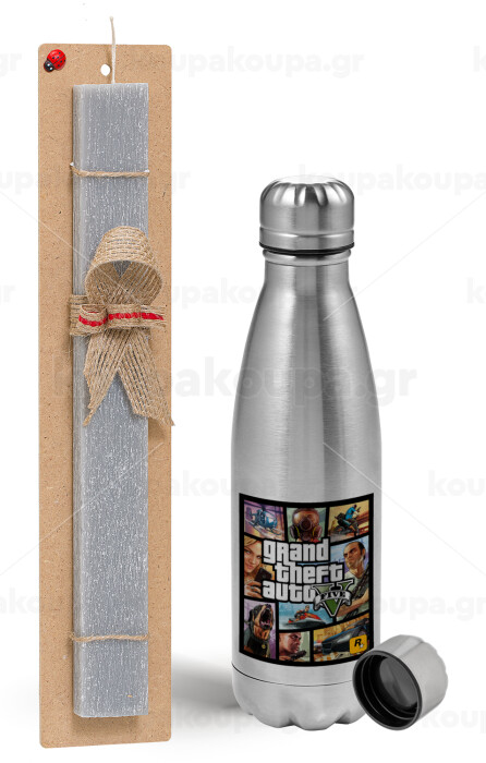 GTA V, Easter Set, metallic Inox water bottle (750ml) & aromatic flat Easter candle (30cm) (GRAY)