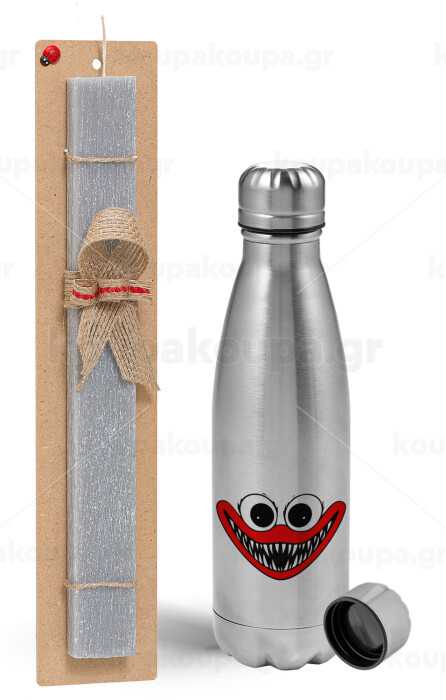 Huggy wuggy, Easter Set, metallic Inox water bottle (750ml) & aromatic flat Easter candle (30cm) (GRAY)