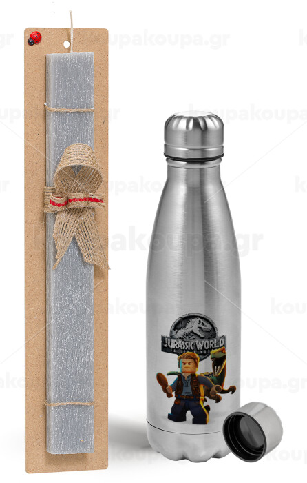 Jurassic world, Easter Set, metallic Inox water bottle (750ml) & aromatic flat Easter candle (30cm) (GRAY)