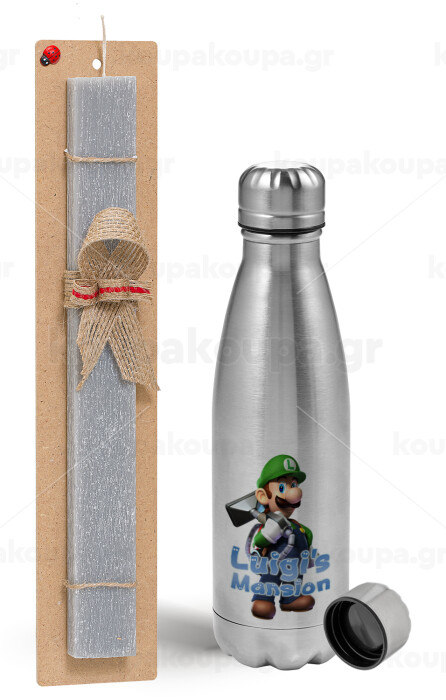 Luigi's Mansion, Easter Set, metallic Inox water bottle (750ml) & aromatic flat Easter candle (30cm) (GRAY)