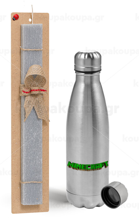 Minecraft logo green, Easter Set, metallic Inox water bottle (750ml) & aromatic flat Easter candle (30cm) (GRAY)
