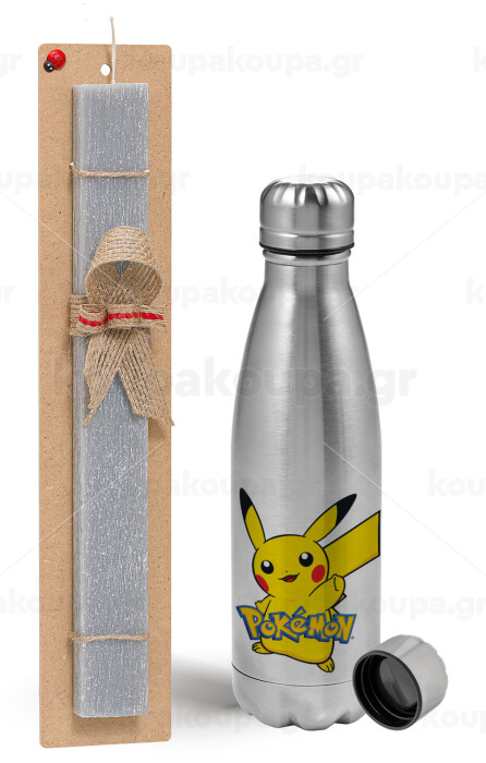 Pokemon pikachu, Easter Set, metallic Inox water bottle (750ml) & aromatic flat Easter candle (30cm) (GRAY)