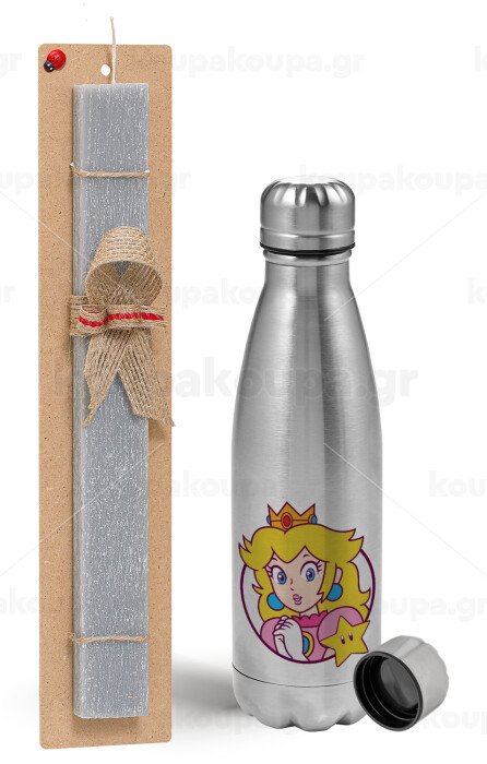 Princess Peach, Easter Set, metallic Inox water bottle (750ml) & aromatic flat Easter candle (30cm) (GRAY)