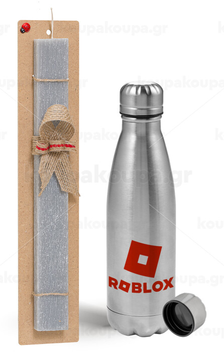 Roblox red, Easter Set, metallic Inox water bottle (750ml) & aromatic flat Easter candle (30cm) (GRAY)