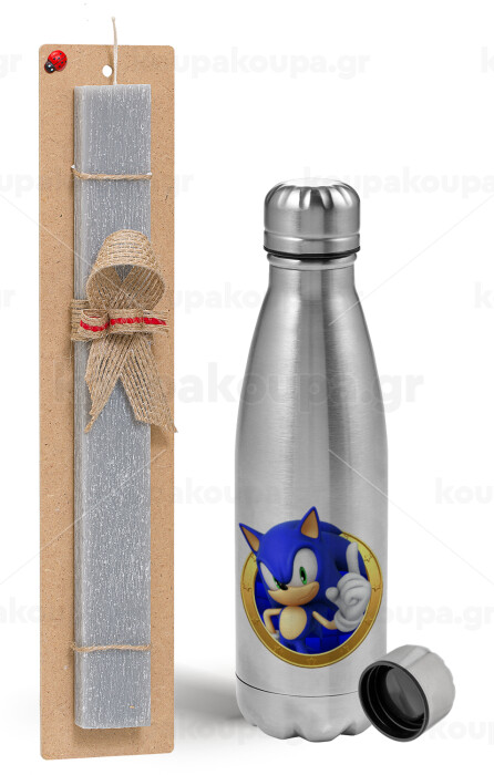 Sonic the hedgehog, Easter Set, metallic Inox water bottle (750ml) & aromatic flat Easter candle (30cm) (GRAY)