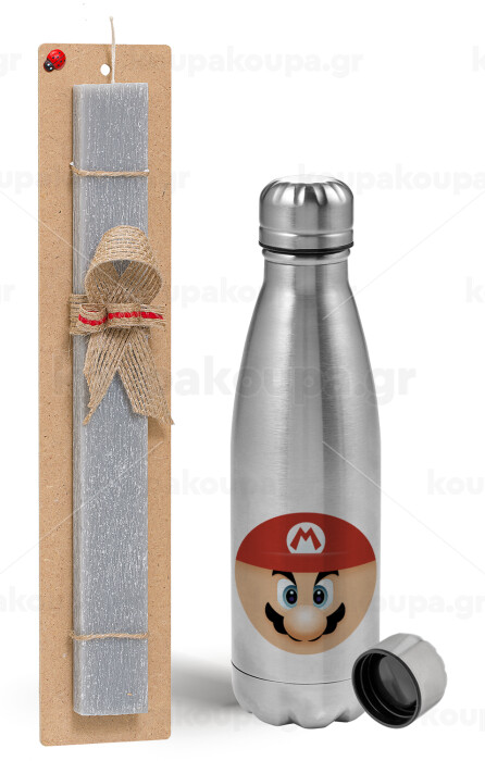 Super mario flat, Easter Set, metallic Inox water bottle (750ml) & aromatic flat Easter candle (30cm) (GRAY)