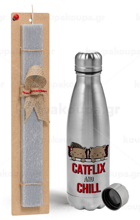 Catflix and Chill, Easter Set, metallic Inox water bottle (750ml) & aromatic flat Easter candle (30cm) (GRAY)