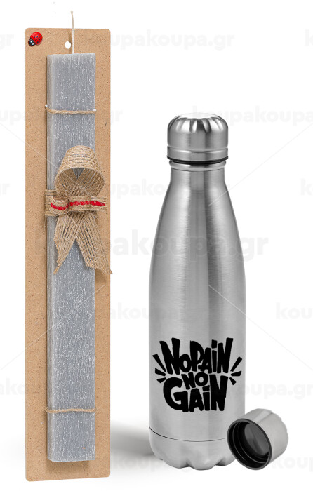 No pain no gain, Easter Set, metallic Inox water bottle (750ml) & aromatic flat Easter candle (30cm) (GRAY)