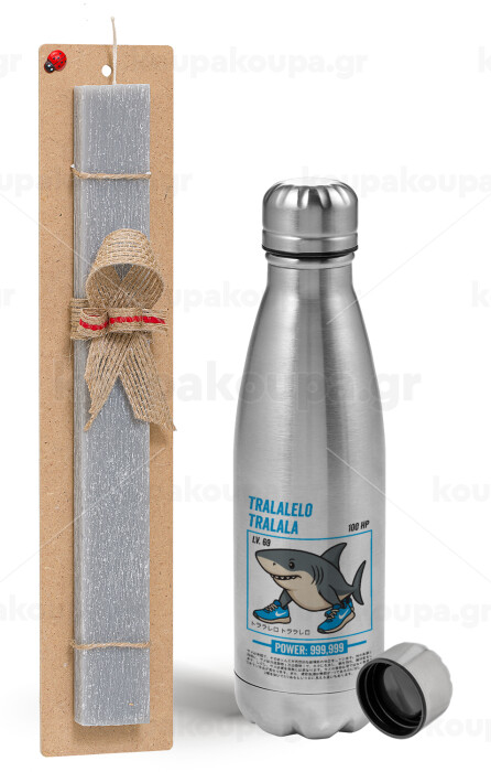 Tralalero Tralala, Easter Set, metallic Inox water bottle (750ml) & aromatic flat Easter candle (30cm) (GRAY)