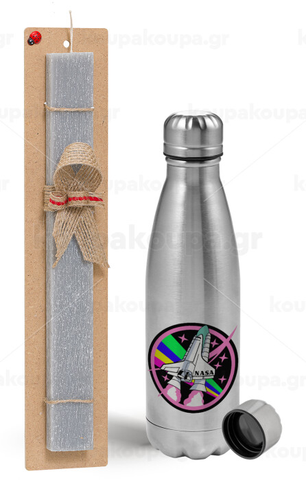 NASA pink, Easter Set, metallic Inox water bottle (750ml) & aromatic flat Easter candle (30cm) (GRAY)