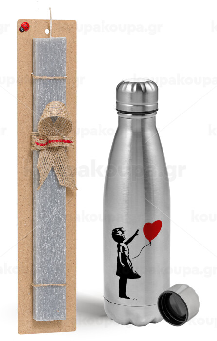 Banksy (Hope), Easter Set, metallic Inox water bottle (750ml) & aromatic flat Easter candle (30cm) (GRAY)