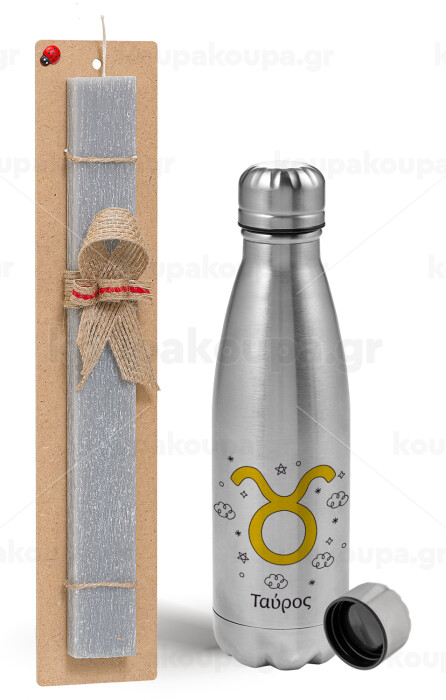 Ζώδια Ταύρος, Easter Set, metallic Inox water bottle (750ml) & aromatic flat Easter candle (30cm) (GRAY)