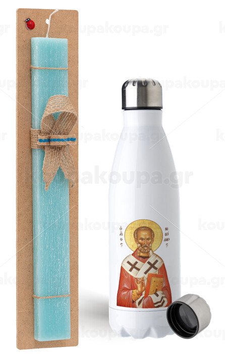 Saint Nicholas orthodox , Easter Set, metallic stainless steel water bottle (750ml) & aromatic flat Easter candle (30cm) (TURQUOISE)