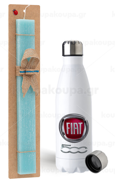 FIAT 500, Easter Set, metallic stainless steel water bottle (750ml) & aromatic flat Easter candle (30cm) (TURQUOISE)