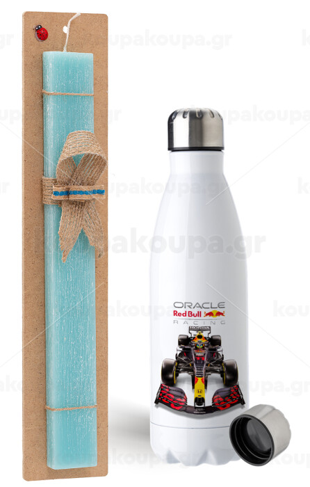 Redbull Racing Team F1, Easter Set, metallic stainless steel water bottle (750ml) & aromatic flat Easter candle (30cm) (TURQUOISE)