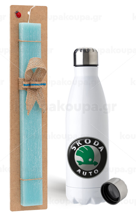 SKODA, Easter Set, metallic stainless steel water bottle (750ml) & aromatic flat Easter candle (30cm) (TURQUOISE)