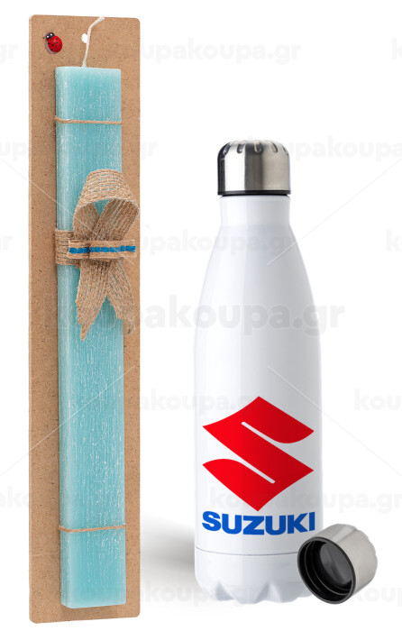 SUZUKI, Easter Set, metallic stainless steel water bottle (750ml) & aromatic flat Easter candle (30cm) (TURQUOISE)