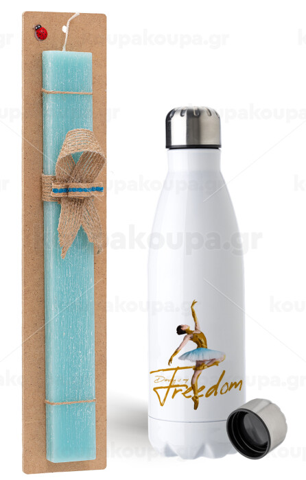 Gold Dancer, Easter Set, metallic stainless steel water bottle (750ml) & aromatic flat Easter candle (30cm) (TURQUOISE)