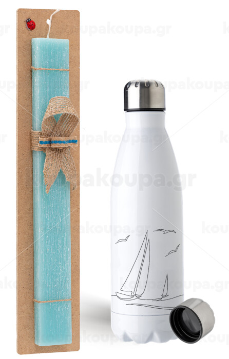 Sailing, Easter Set, metallic stainless steel water bottle (750ml) & aromatic flat Easter candle (30cm) (TURQUOISE)
