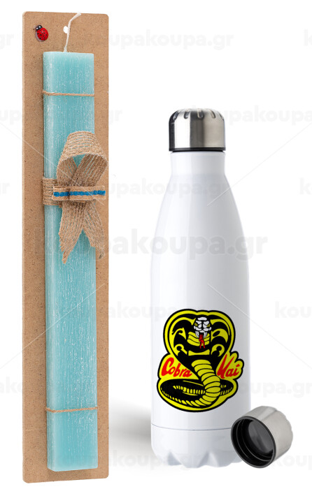 Cobra Kai Yellow, Easter Set, metallic stainless steel water bottle (750ml) & aromatic flat Easter candle (30cm) (TURQUOISE)
