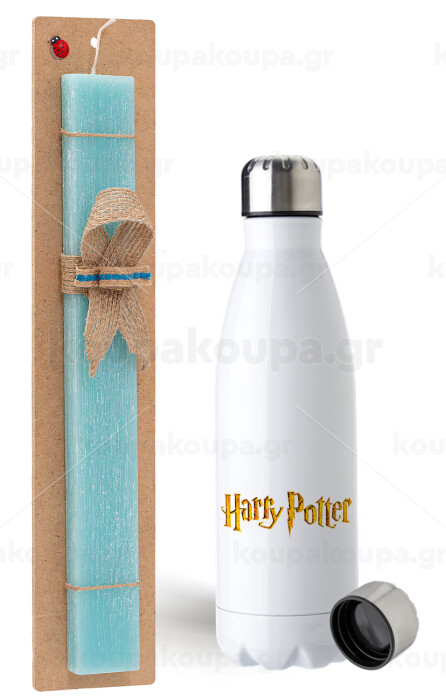 Harry potter movie, Easter Set, metallic stainless steel water bottle (750ml) & aromatic flat Easter candle (30cm) (TURQUOISE)