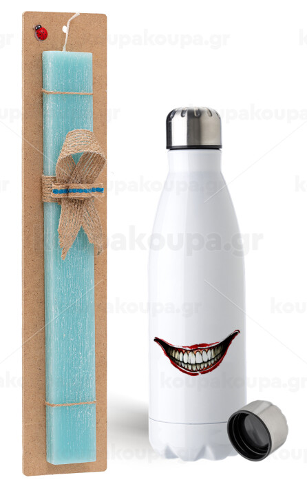 Joker smile, Easter Set, metallic stainless steel water bottle (750ml) & aromatic flat Easter candle (30cm) (TURQUOISE)