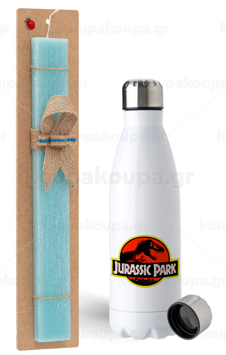 Jurassic park, Easter Set, metallic stainless steel water bottle (750ml) & aromatic flat Easter candle (30cm) (TURQUOISE)