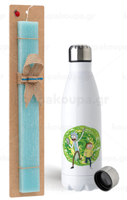 Rick and Morty, Easter Set, metallic stainless steel water bottle (750ml) & aromatic flat Easter candle (30cm) (TURQUOISE)