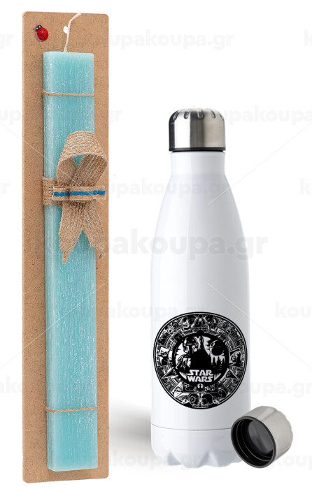 Star Wars Disk, Easter Set, metallic stainless steel water bottle (750ml) & aromatic flat Easter candle (30cm) (TURQUOISE)