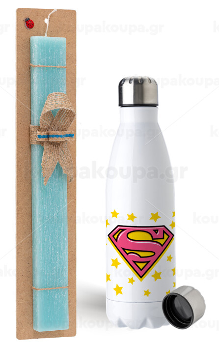Superman Pink, Easter Set, metallic stainless steel water bottle (750ml) & aromatic flat Easter candle (30cm) (TURQUOISE)