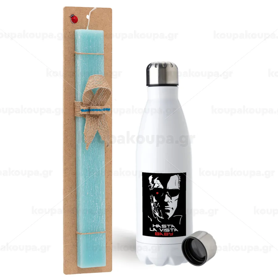 Terminator Hasta La Vista, Easter Set, metallic stainless steel water bottle (750ml) & aromatic flat Easter candle (30cm) (TURQUOISE)