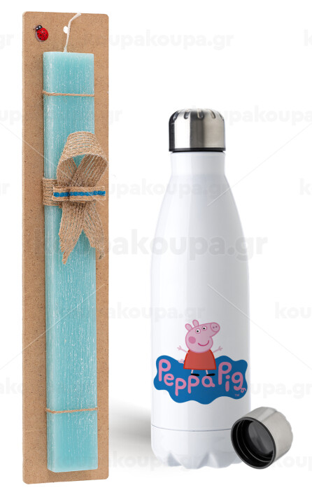 Πέππα το γουρουνάκι μπλε με όνομα, Easter Set, metallic stainless steel water bottle (750ml) & aromatic flat Easter candle (30cm) (TURQUOISE)