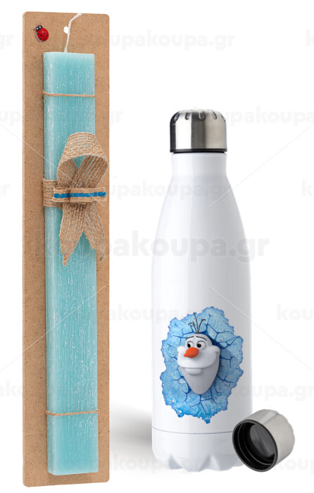 Frozen Olaf, Easter Set, metallic stainless steel water bottle (750ml) & aromatic flat Easter candle (30cm) (TURQUOISE)