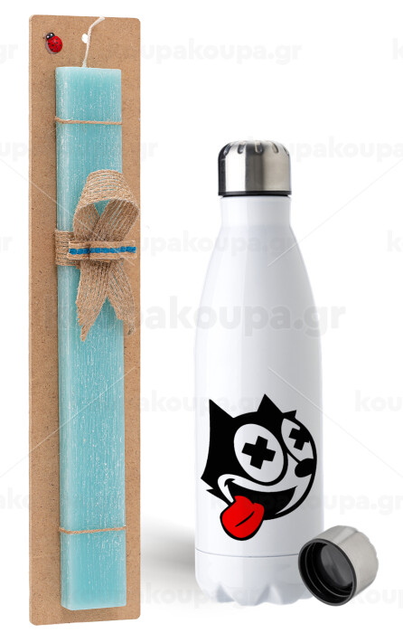 helix the cat, Easter Set, metallic stainless steel water bottle (750ml) & aromatic flat Easter candle (30cm) (TURQUOISE)