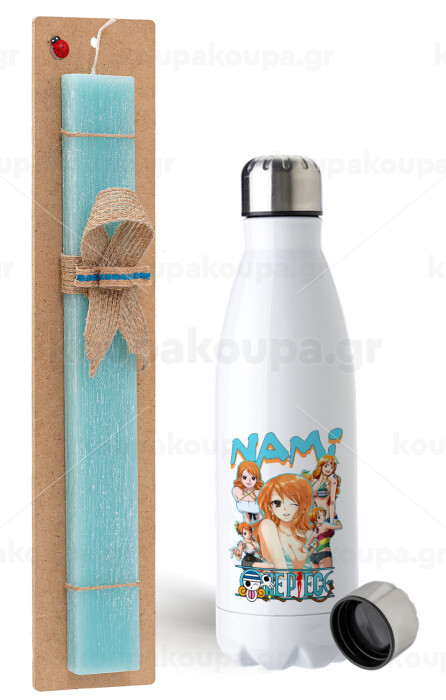 Nami One Piece, Easter Set, metallic stainless steel water bottle (750ml) & aromatic flat Easter candle (30cm) (TURQUOISE)