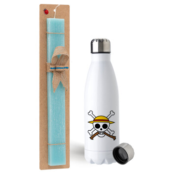 Onepiece skull, Easter Set, metallic stainless steel water bottle (750ml) & aromatic flat Easter candle (30cm) (TURQUOISE)