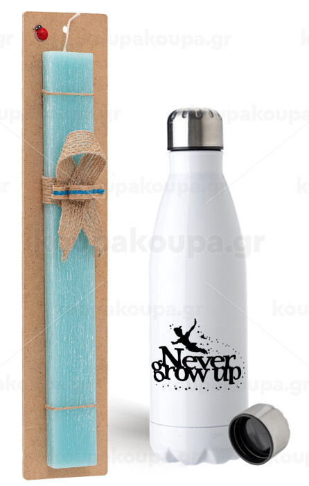 Peter pan, Never Grow UP, Easter Set, metallic stainless steel water bottle (750ml) & aromatic flat Easter candle (30cm) (TURQUOISE)
