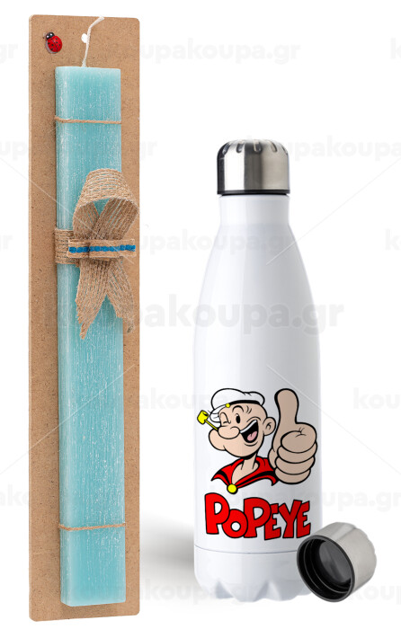 Popeye the sailor man, Easter Set, metallic stainless steel water bottle (750ml) & aromatic flat Easter candle (30cm) (TURQUOISE)