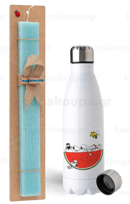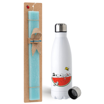 Snoopy summer, Easter Set, metallic stainless steel water bottle (750ml) & aromatic flat Easter candle (30cm) (TURQUOISE)