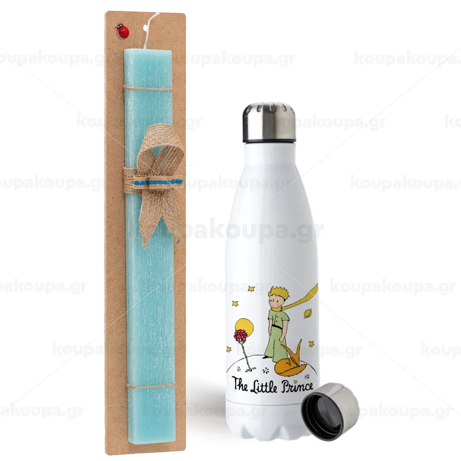 The Little prince classic, Easter Set, metallic stainless steel water bottle (750ml) & aromatic flat Easter candle (30cm) (TURQUOISE)