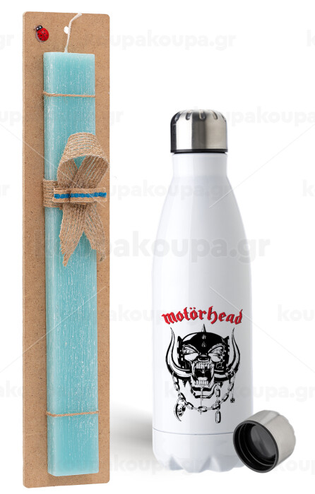 motorhead, Easter Set, metallic stainless steel water bottle (750ml) & aromatic flat Easter candle (30cm) (TURQUOISE)