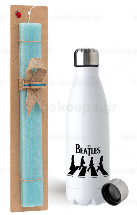 The Beatles, Abbey Road, Easter Set, metallic stainless steel water bottle (750ml) & aromatic flat Easter candle (30cm) (TURQUOISE)