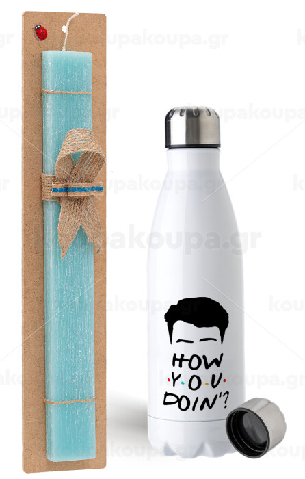 Friends how you doin?, Easter Set, metallic stainless steel water bottle (750ml) & aromatic flat Easter candle (30cm) (TURQUOISE)