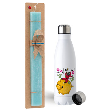 Squid game money pig, Easter Set, metallic stainless steel water bottle (750ml) & aromatic flat Easter candle (30cm) (TURQUOISE)