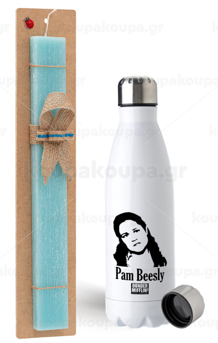 The office Pam Beesly, Easter Set, metallic stainless steel water bottle (750ml) & aromatic flat Easter candle (30cm) (TURQUOISE)