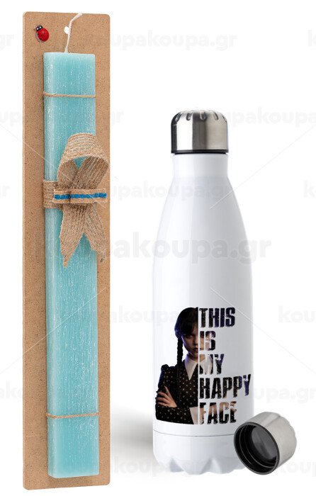 Wednesday, This is my happy face, Easter Set, metallic stainless steel water bottle (750ml) & aromatic flat Easter candle (30cm) (TURQUOISE)