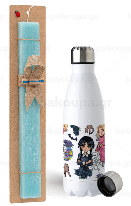 Wednesday and Enid Sinclair, Easter Set, metallic stainless steel water bottle (750ml) & aromatic flat Easter candle (30cm) (TURQUOISE)