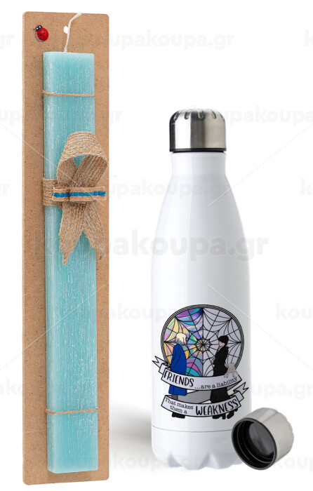 Wednesday window, Easter Set, metallic stainless steel water bottle (750ml) & aromatic flat Easter candle (30cm) (TURQUOISE)