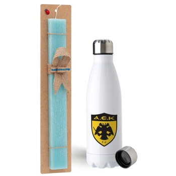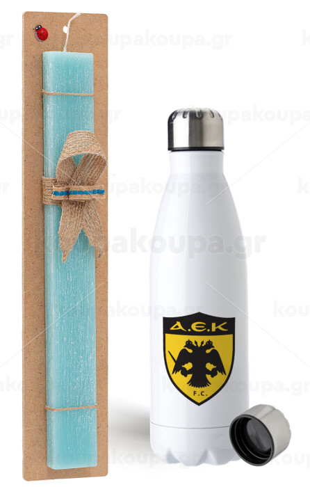ΑΕΚ, Easter Set, metallic stainless steel water bottle (750ml) & aromatic flat Easter candle (30cm) (TURQUOISE)