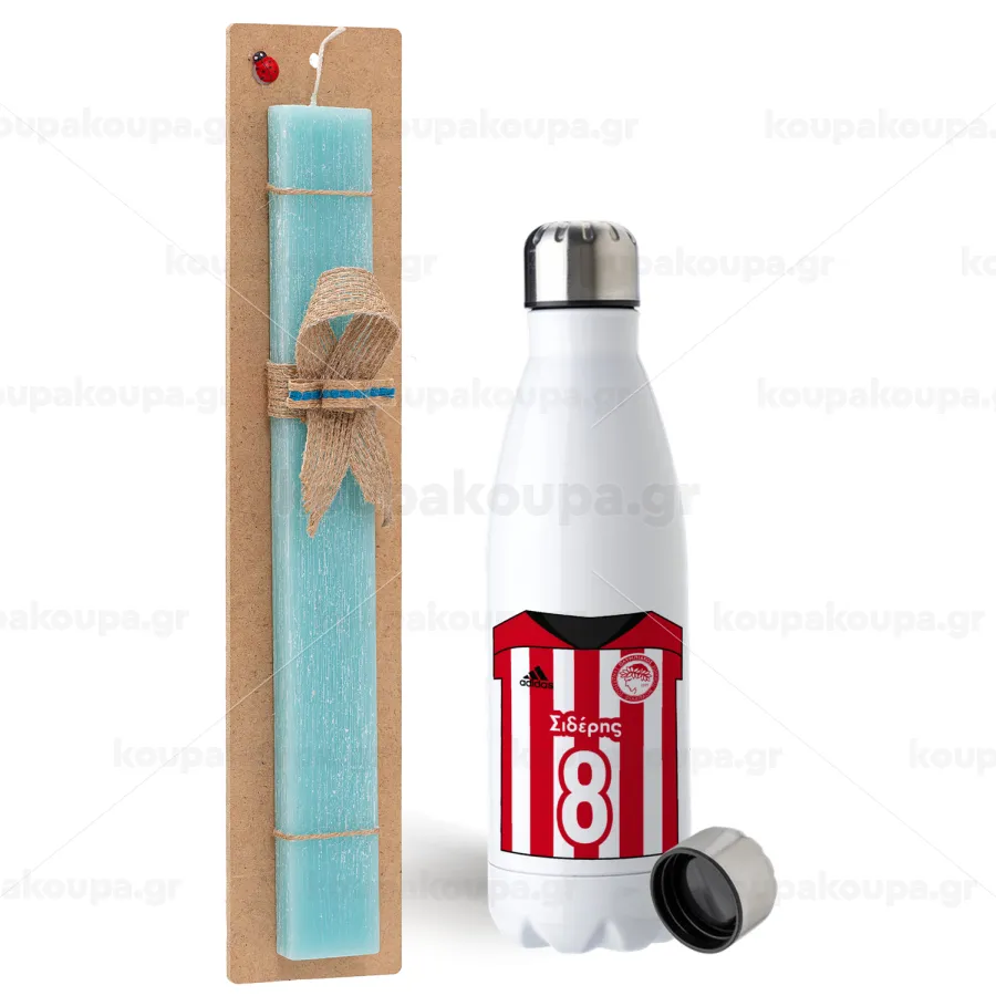 Ολυμπιακός εμφάνιση, Easter Set, metallic stainless steel water bottle (750ml) & aromatic flat Easter candle (30cm) (TURQUOISE)